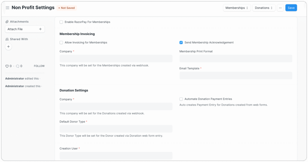 Non-profits rely heavily on donations made by charitable people or organizations to show their support for their cause. ERPNext helps you keep track of donors and the donations they make by recording important information like donor type, date of donation, mode of payment and payment ID. You can also configure ERPNext to create payment entries automatically on submitting a donation, and create certificates to let donors avail tax deductions.