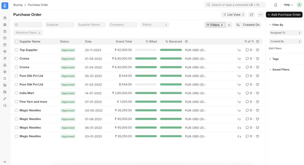 Late deliveries and pricing issues can impact profits. ERPNext automates purchase requests, tracks vendor performance, and helps you negotiate better deals. Streamline sourcing and procurement to get the best suppliers at the best prices.
